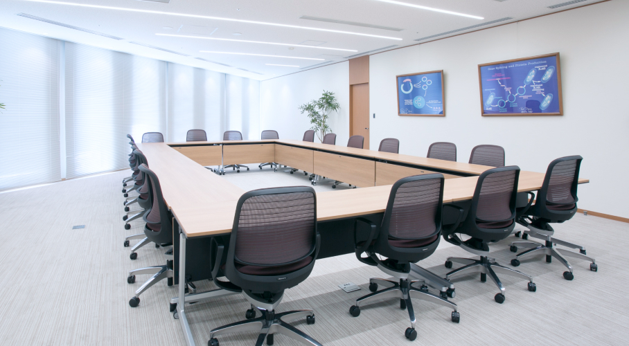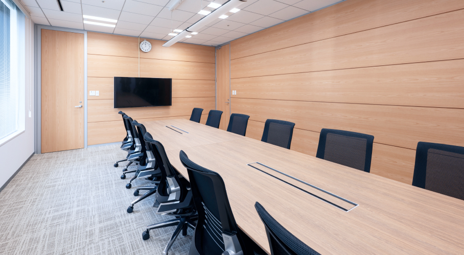 東京オフィスには2つの会議室があります。大阪オフィスや海外などとの打合せのため、大阪オフィスの会議室と同じように、テレビ会議システムを備えています。