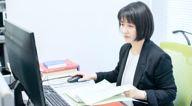 韓国の案件などではたまに日本語が通じることもありますが、基本的にコミュニケーションもレターも英語です。日本から外国に出願するケースは前の事務所でも扱っていましたが、いまは日本から外国に出願する案件はもちろんのこと、日本での出願を希望する外国のクライアントの案件も多くあり、これまで以上に高度な英語力と国ごとの法律の知識が必要になりました。前の事務所では、難度の高い英文レターなどはちょっと手伝っていただくこともあったんです。でもここでは、担当者がきちんとしたレターを自分で作成する、というのが事務所の方針で、自力でこなさなくてはいけないので、英語力のさらなる向上に努めています!