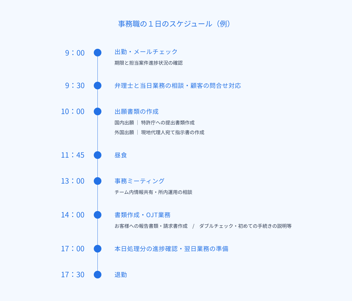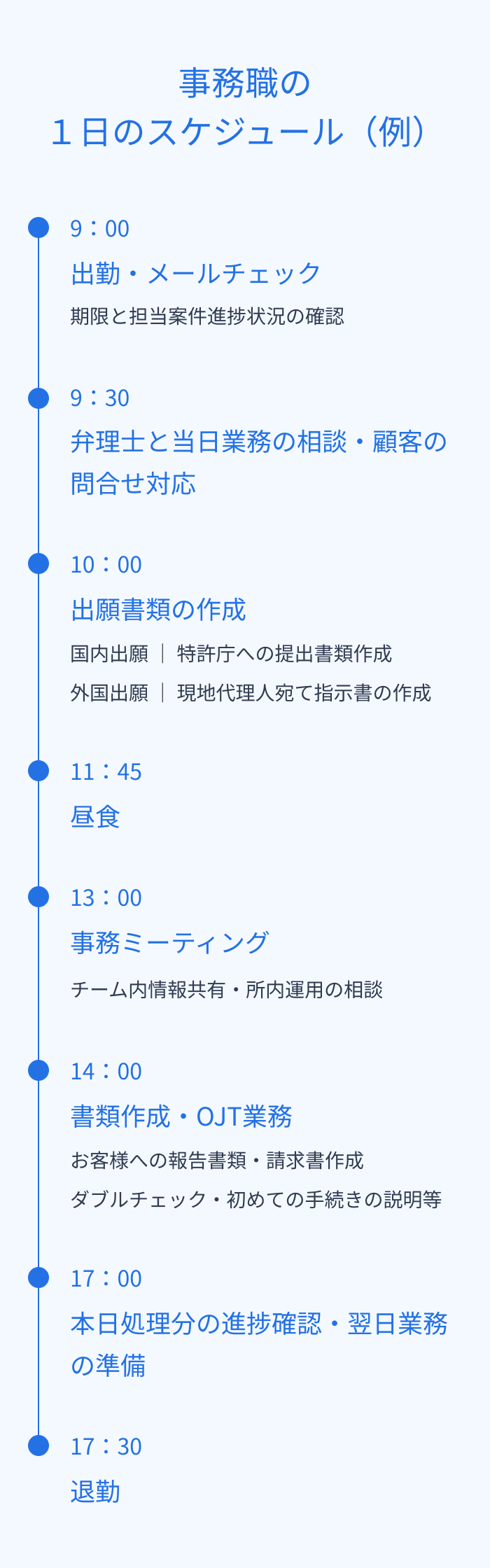 原則として分業制を取っていませんので多様な業務に携わることができ、さらに国内だけでなく諸外国の案件を扱うことで、専門性が高まります。まずは数社のクライアントを担当することから基礎を身につけ、経験を積むにつれて、担当クライアントの兼任や、後輩事務の指導など、活躍の場も広がっていきます。