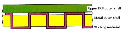 the fiber-reinforced plastic outer shell (21) and the metal outer shell (11) are connected with each other by extending *2) a fiber-reinforced plastic stitching material (22) between a bonding boundary surface side of the metal shell with the fiber-reinforced plastic outer shell (21) and an opposite side of the metal shell through the *1) through-holes (13) to connect the fiber-reinforced plastic outer shell (21) and the metal outer shell (11). (Reference numerals added)