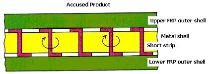The accused product employs, on the other hand, employs “a plurality of short strips” each extending between the upper and lower surfaces of the metal shell, as indicated below.
