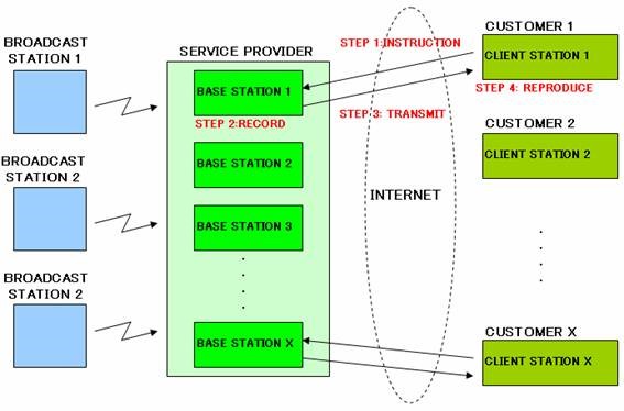 The defendant company, NIHON DIGITAL CO., LTD (NYX) manufactures, sales, and leases an internet-based communication system ROKURAKU-II consisting of a pair of devices, i..e, base and client stations. The base station has a TV tuner installed therein for receiving analogue terrestrial broadcast signal of TV program, converting the received analogue signal to digital signal, and transmitting the converted digital signal through internet. The client station is designed to transmit a signal to the associated base station through internet, instructing the base station to transmit the recorded TV program to the client station where the TV program is reproduced by the customer. The base stations are kept and administered by the service provider NYX and the client stations are kept by the customers of the service living outside Japan, for example. In operation, the customer operates his or her client station to instruct the associated base station away from the client station through internet for recording a specific TV program. The instruction is transmitted through internet to the associated base station (STEP 1). Upon receipt of the instruction, the base station records an analogue TV program designated by the instruction (STEP 2). The recorded TV program is then converted into digital data which is transmitted to the client station through internet (STEP 3). The TV program received by the client station is then reproduced by the customer for watching (STEP 4).