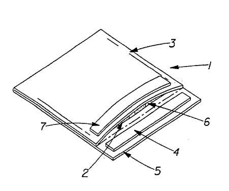 1: flexible plastic sheet, 2: absorbent material, 3: border of the sheet along its lateral edges, 4: sealing means, 5: closure flap, 6: opening, 7: contact surface