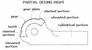 The registered partial design right No.1399739 relates to a design of a front head portion of the angular adjustment tool. As shown in Figure A3, the characteristic design portion, which is indicated by solid lines, relates to a gear plate, in particular, which comprises an external gear with teeth, slanted portions and elevated portions, the slanted and elevated portions being provided adjacent opposite ends of the gear. Portions indicated by dotted lines and imaginary lines are outside the scope of the partial design.
