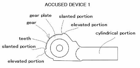 The design of the head portion of the accused device 2, indicated in Figure B2, is somewhat different from the registered design in that the elevated portions are in part removed to define projections as shown in Figure B2′. Interestingly, the court said that the red-colored removed portions are outside the region of the registered partial design right and do not have to be used in the determination of similarity between the registered partial design and the design of accused device.