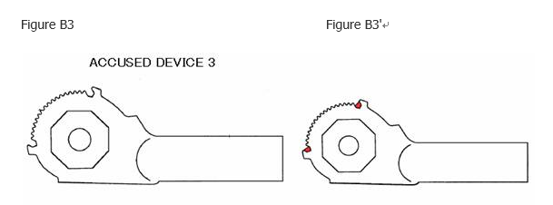 The design of the head portion of the accused device 3, indicated in Figure B3, is also somewhat different from the registered design in that the projections are further in part removed as indicated in red in Figure B3′. The court said that (i) the U-shaped recesses result in an unique impression, (ii) the projections adjacent the opposite ends of the gear are noticeable portions in the registered partial design and therefore removals or recesses of the projection, even if they occupy small parts of the projections, provides a different visual effect beyond commonality between the registered and accused design.