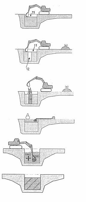 (B) filling the excavated soils (S), solidification agent such as cement (C) and water (W) in certain proportions into the cavity (2) while an amount of water (W) is adjusted according to a water content of the soils (S); (Figure 2)