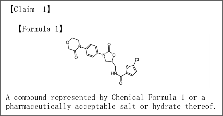 The scope of the claims of this patent is the compound shown in Claim 1 [Chemical Formula 1], sometimes referred to as “rivaroxaban.”