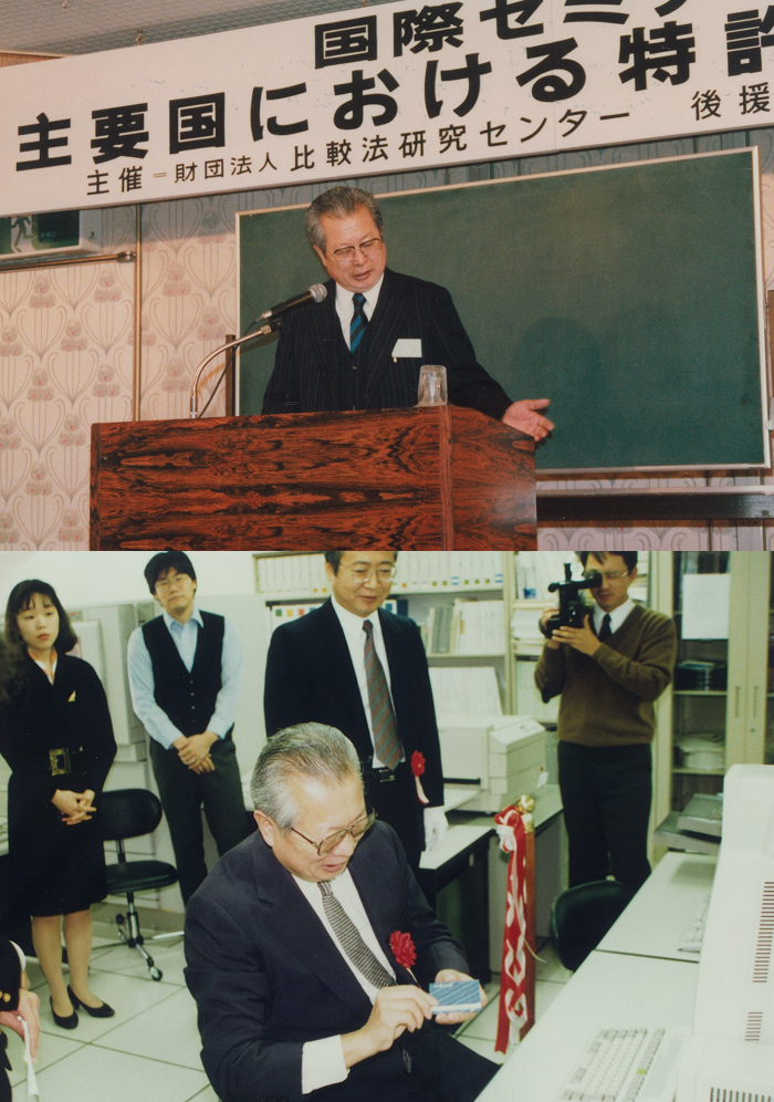 写真上:日本初の国際特許セミナ-にて講演。(1985年)