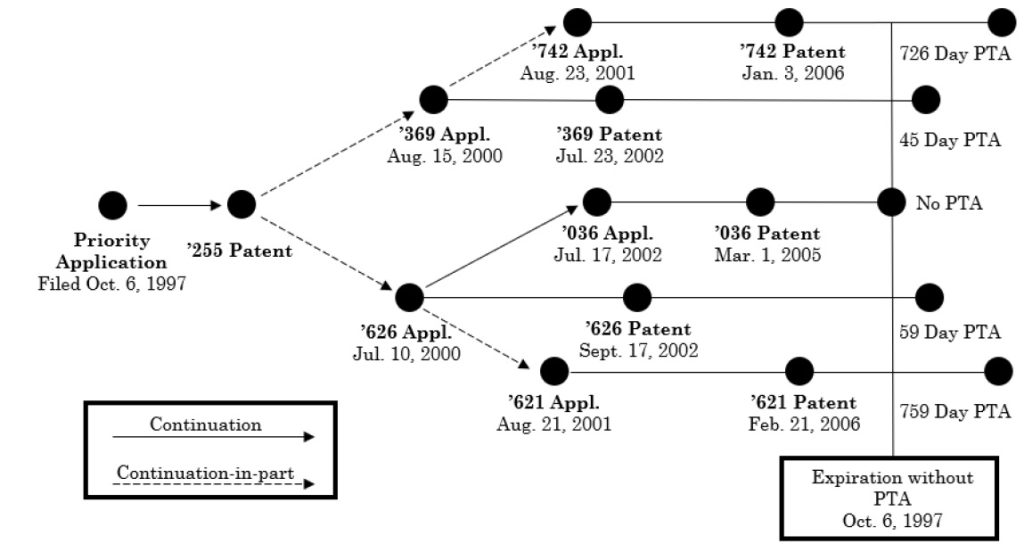 二重特許には「同一発明型」(same invention type)と「自明型」(obviousness-type)の2種類がある。本件は、1件の親特許から継続出願(一部継続出願を含む)により5件の特許が派生し、そのうち4件がPTAの適用を受けた。通常の特許実務では、自明型二重特許のリスクを回避するためにターミナルディスクレーマが提出されることが多いが、本件についてターミナルディスクレーマは提出されていなかった。しかし、ターミナルディスクレーマが提出されていたとしたら、それにより放棄されたPTAの期間を維持することはできないため、4つの特許は、’036特許の満了日に満了していたことになる。