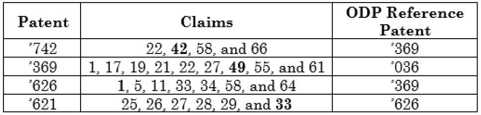 Cellectは、Samsungを相手に上記4件の特許(’742特許、’369特許、’626特許および’621特許)に基づきコロラド州連邦地方裁判所に侵害訴訟を提起した。Samsungは各々の特許に対して米国特許商標庁(USPTO)に査定系再審査(Ex Parte Reexamination)を請求し、当該4件の特許は互いに自明型二重特許(obviousness-type double patenting; 以下、「ODP」)を根拠に特許可能でないと主張した。再審査手続において、主張されたクレームとODP参照特許の関係は次のとおりである(太字は代表的なクレームを示す)。