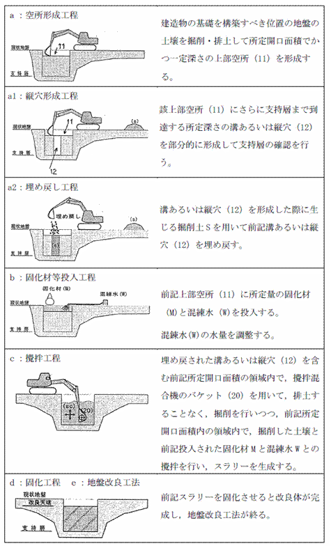 建造物の基礎を構築すべき位置の地盤の土壌を掘削・排土して所定開口面積で且つ所定深さの空所(2)を形成し,該空所(2)内に先に掘削・排土した土壌(S)とセメント等の固化材(C)と水(W)とをそれぞれ所定割合づつ投入する際に,該水(W)の量を前記土壌(S)中に含まれる含水量に応じて増減させ,それらの材料を該空所(2)内で混合・撹拌して,調整含水比を所定値に調整した固化材・土壌混合スラリー(SC)を生成し,該固化材・土壌混合スラリー(SC)を固化させる,ことを特徴とする地盤改良工法。