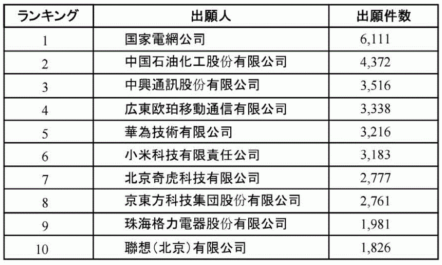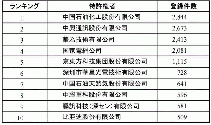 2015年度の発明特許出願件数による中国国内企業トップ10