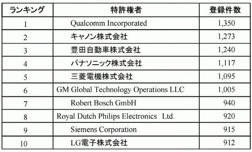 2015年度の発明特許出願件数による外国企業トップ10
